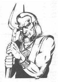 Belial is less of a demon than a devil, if such differentiations make a wit of difference. Belial is said to have both the most handsome and diabolic appearance of all the devils. He is a tall, dark humanioid with small horns on his head, dresses always in regal finery and carries a ranseur. He is handsome and sexual, with large slanted eyes that smolder red. he reigns over the Fourth circle of Hell.